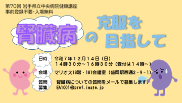 今回のテーマは「腎臓病の克服を目指して」です。お気軽にお越しください♪