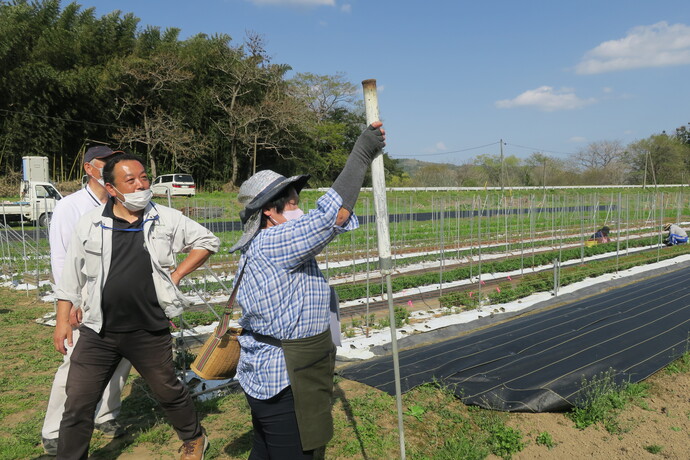 当日は、園主の方を講師として、畑の耕起、薬剤散布、必要な資材、除草対策などのポイントを説明していただきました。また、3年株以降の株管理の、株仕立て作業の実演が行われました。