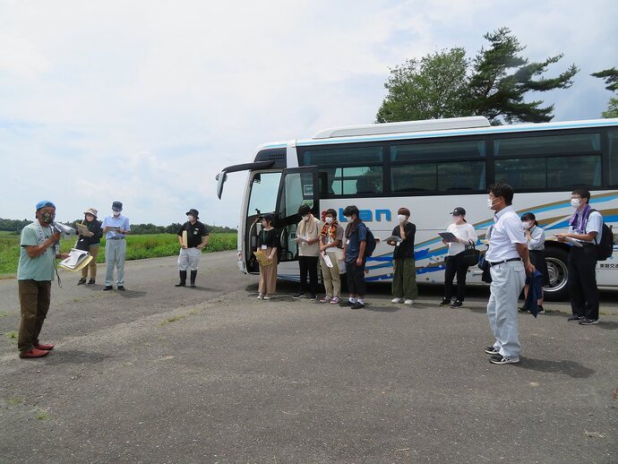 農業大学校生5名、農業に興味を持つ高校生3名参加のもと、現地研修では一関地方の果樹栽培の特徴、一関遊水地における大規模営農について学びました。
