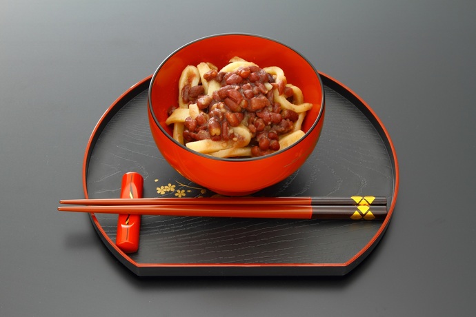 1 はっとうは、小豆汁のなかに直接入れ煮る方法もある。その場合、汁にとろみが出る。別に茹でた場合はさらりとした食感となる。