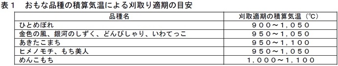 - 登熟の進み具合は気温・日照時間だけでなく、栽培管理も影響します。積算気温の予測のみに頼らず、実際の籾の黄化をよく観察した上で刈取りの可否を判断することが大切です。
