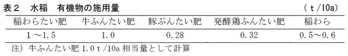 有機物の種類により、施用量が異なりますので、表2を参考に適正量を施用してください。