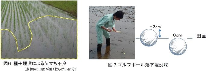 - 播種直前に少量を手で試し播きし、種子が埋没しないことを確認します。落水時の田面の硬さの目安は、1m高からのゴルフボール落下時の埋没深で概ね-2~0cmです(図7 移植と同程度~やや固めの範囲)。