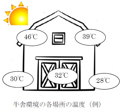 このことにより、暑熱対策は準備を含めて、4月下旬から取り組む必要があります。放熱温度計などで牛舎環境の温度を測定して(右図)、牛舎環境の現状把握を行い、環境に沿った対策を検討してください。有効対策例は下記のとおりです。