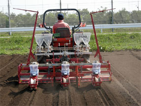 平成25年6月6日、試験のため大豆の播種を行いました。ずっと晴天が続いているので、この辺で一雨欲しいところですね。今後、試験状況などを本コーナーで随時紹介していきます。