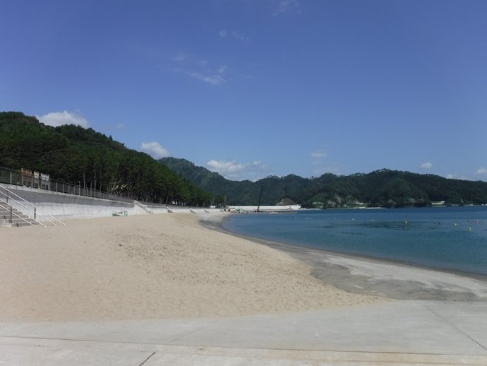 県では震災の津波で砂浜が流失した根浜海岸で砂浜を再生する工事を実施し、延長450mのうち150mが完了しました。今後、残り300mの工事を行う予定です。