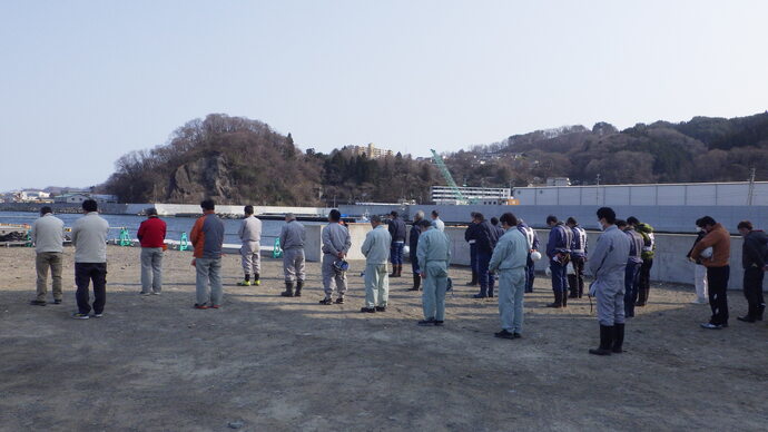 東日本大震災発災から10年の節目を迎えた令和3年3月11日(木曜)に、大槌川水門、鵜住居川水門、甲子川水門の3箇所において、東日本大震災津波の被災者に対する追悼セレモニーを開催しました。追悼セレモニーでは、沿岸広域振興局土木部職員や各水門施工業者計123名(大槌川水門61名、鵜住居川水門33名、甲子川水門29名)が集まり、東北地方太平洋沖地震の発生時刻である14時46分に合わせて黙とうを行いました。