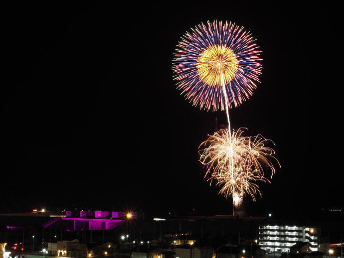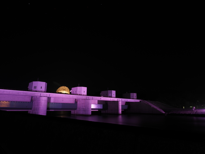 また、同日夜には大槌川水門、鵜住居川水門において水門のライトアップを行いました。ライトアップと同時刻にそれぞれの水門付近で花火が上がり、観覧された方は、てんでんに鎮魂の思いを捧げ、大切な人へ思いを馳せた様子でした。