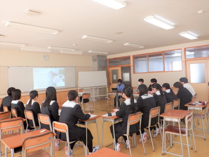 プロジェクトの主役である大船渡東高校食物文化科の1、2年生に取組をイメージしてもらえるよう、「岩手の海で起きていること」や「暖かい海水を好む魚」について越喜来漁協、当センター職員による講演会を行いました。