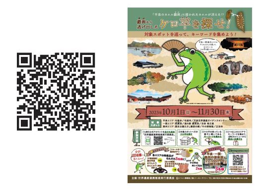 各エリアの対象スポットにいるケロ平が持つ扇子に書かれたキーワードを集めることで、地域の特産品等プレゼント企画(合計20名)に御応募いただけます。