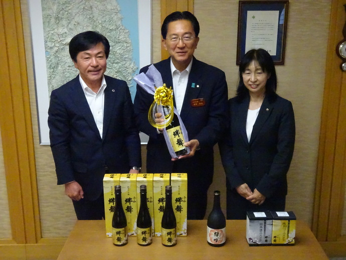 - 午後4時20分 47都道府県のお米で作った日本酒「絆舞令和」の贈呈を受けました(第一応接室)