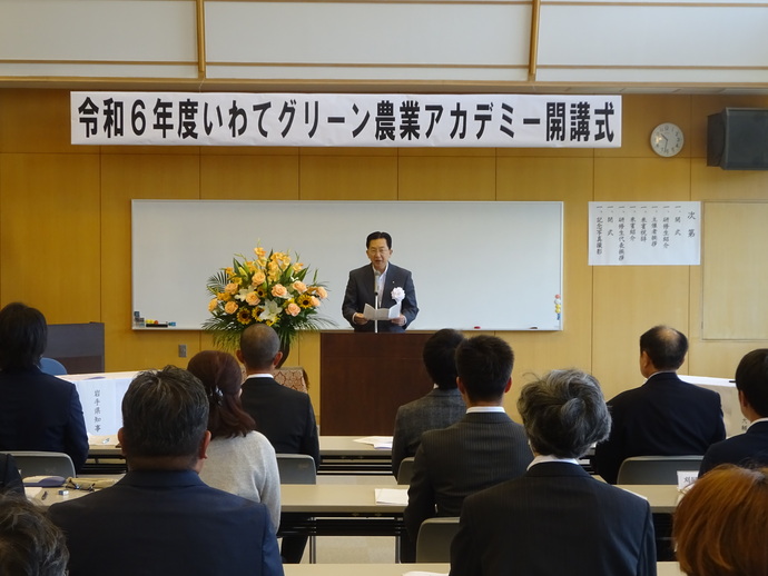 - 午前10時30分 有機農業をはじめとした環境保全型農業の実践者を育成することを目的とした「令和6年度いわてグリーン農業アカデミー」の開講式に出席し、挨拶を述べました。(県北農業研究所)