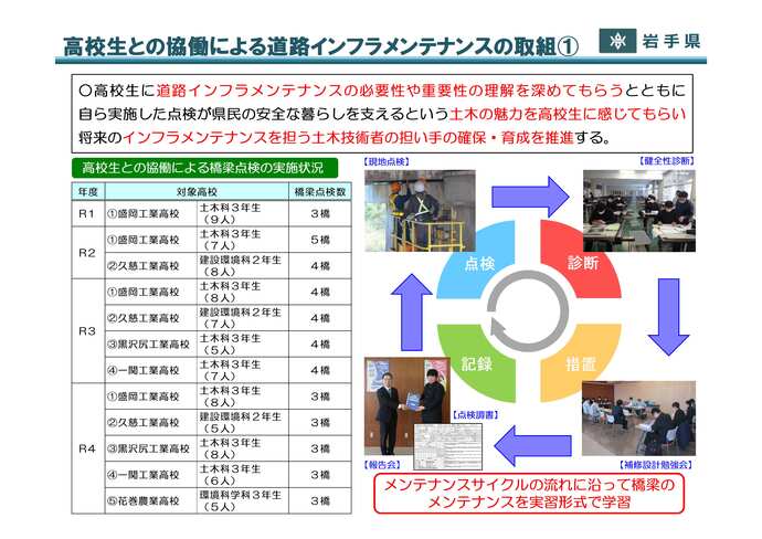 本取組に参加した生徒の中には、県内の自治体や建設企業・コンサルタントへの入職者もおり、将来のインフラメンテナンスを担う人材の確保・育成につながっています。