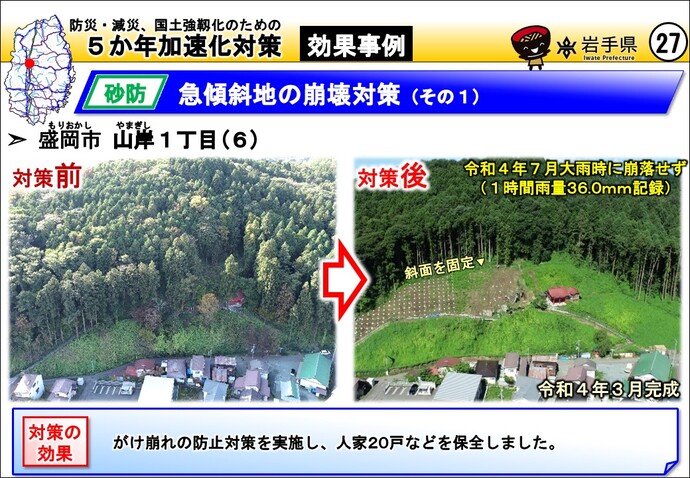 がけ崩れの防止対策を実施し、人家20戸などを保全しました。
