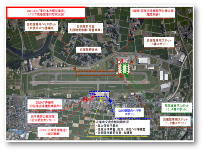当時、いわて花巻空港は旧エプロンでの供用中で現在の新エプロンや平行誘導路といった施設が完成していませんでした。そのため、通常運用時でも定期便や小型機で埋まるエプロン(駐機場)に、定期便と無数の救援ヘリコプターが混在する状態でした。この経験をもとに、自衛隊や国土交通省、県などで所属の異なるヘリコプターの運航を調整する仕組みができました。