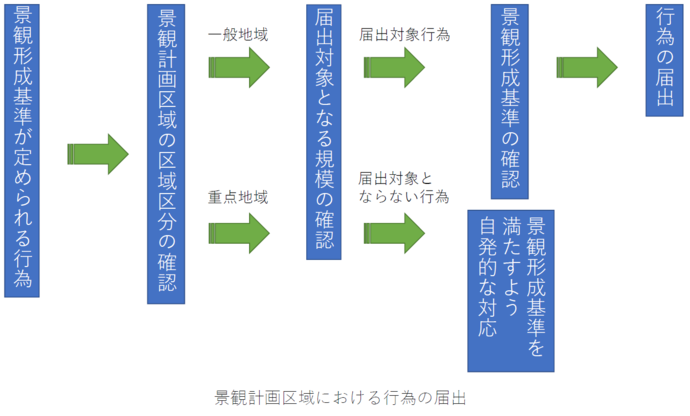 県では、届出対象行為について景観計画区域の区域区分と行為の種類に応じた景観形成基準を定めていますので、確認し基準へ適合するよう努めてください。