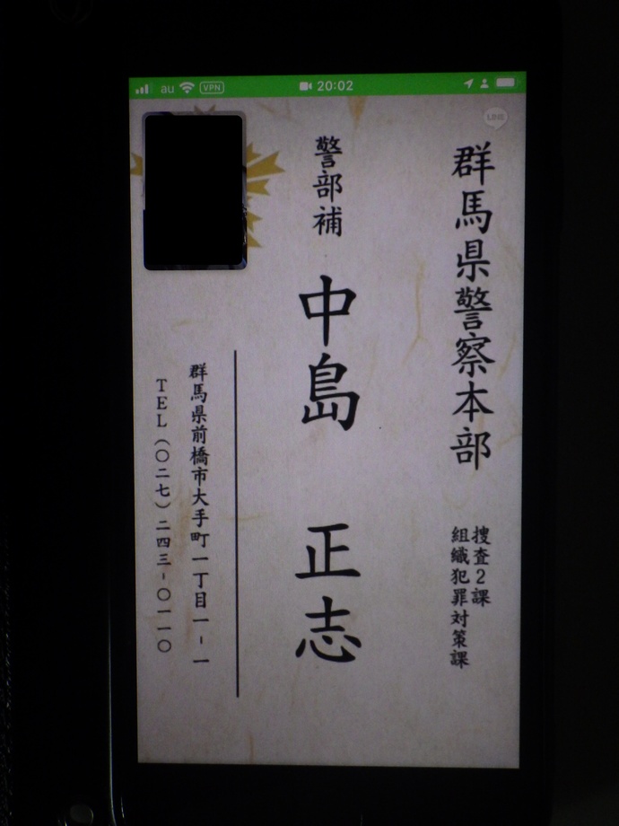 - 被害者は、身に覚えが無かったため、その旨伝えたところ、相手の男性から、「詐欺事件の可能性がある。」等と伝えられ、電話が群馬県警察本部捜査2課組織犯罪対策課の警察官を名乗る男性(以下、「A」と記載。)に転送された。