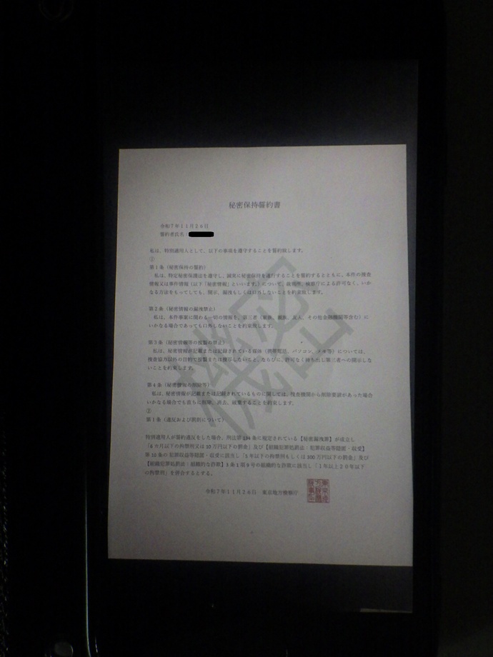 画像4枚(被害者に提示された(1)「秘密保持誓約書」、(2)上記Aの名刺、(3)上記BとLINEビデオ通話をした際のスクリーンショット2枚)を下部に添付します。