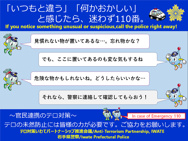 警察では、公共交通機関、情報通信、重要インフラ事業者等の参画を得て、平成29年にテロ対策の官民連携ネットワークである「テロ対策いわてパートナーシップ推進会議」を設置しています。
