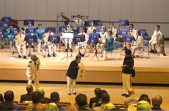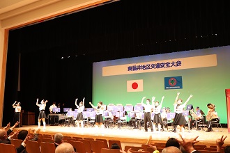 藤沢文化センターで行われた第58回東磐井地区交通安全大会では、「青春の輝き」や「時の流れに身をまかせ」、「演歌メドレー」など往年のヒット曲などを演奏しました。寸劇「3ライト運動」で、車のライト早め点灯、LEDライトや反射材の着用、右からの横断者に注意など、3つのライトに注意するようを呼びかけを行いました。