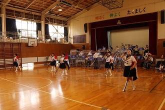 一関市花泉総合福祉センターで行われた老松小学校閉校記念行事、老松小学校ありがとうコンサートでは、「ディズニーランド50周年セレブレーション」や「アルデバラン」などの計6曲を演奏したほか、カラーガード隊による演技で反射材の着用を呼びかけました。