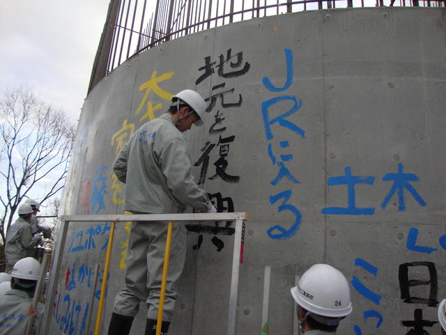 また、本現場見学会では、県内建設企業の将来を担うであろう工業高校生徒に土木の魅力等を感じていただくため、新小谷木橋の下部工(P5橋脚)の基礎部に「将来の夢」のメッセージをペイントしました。