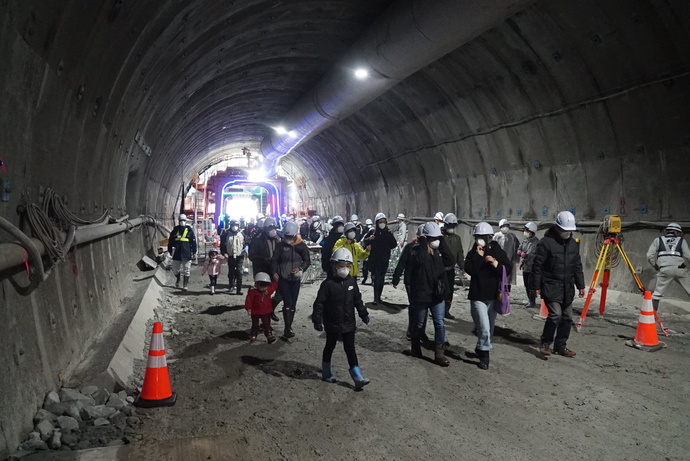 多くの町民の皆様にご参加いただき、工事中のトンネル内を歩いて見学していただきました。