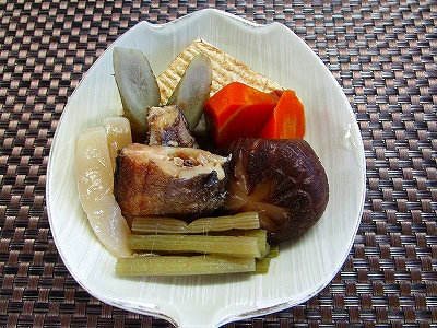 - 鍋にだし汁と1、ごぼう、人参、干ししいたけを入れて煮る。野菜に箸が通るくらいの固さになったら、ふき、焼き豆腐、こんにゃくを入れ、調味料で味付けをし、弱火で10分くらい煮る。