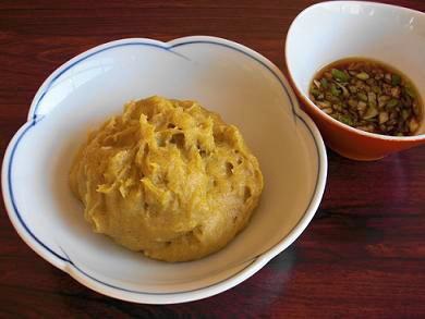 - かぼちゃを煮るときに砂糖を加え甘みをつけたものでそばがきにしてもよい。擂ったくるみをつけて、くるみだんごのようにして食べても美味しい。