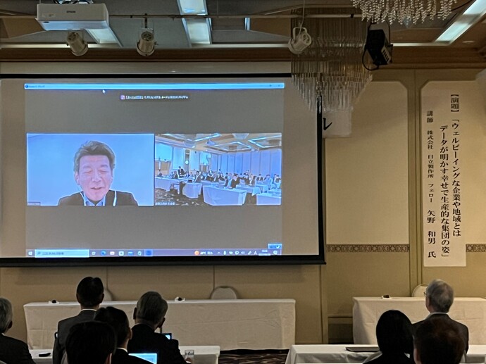 次に、ラウンドテーブルにおいて、株式会社日立製作所 フェロー 矢野 和男 氏を講師に迎え、オンラインで御講演いただくとともに、「地域や企業、団体におけるウェルビーイングに関する現状認識や課題」「地域や企業、団体におけるウェルビーイングの向上に向けた今後の取組や展望」をテーマに、ラウンドテーブルメンバーによるディスカッションを行いました。
