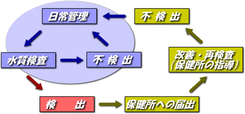 このため、条例では、各施設にマッチした適切な管理が導入されるよう、営業者自らが年に1回以上の水質検査により日常の衛生管理の適否を検証し、菌が検出された場合は保健所に届け出て指導を受け、より的確な管理方法を導入していただくための仕組を規定しています。