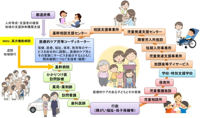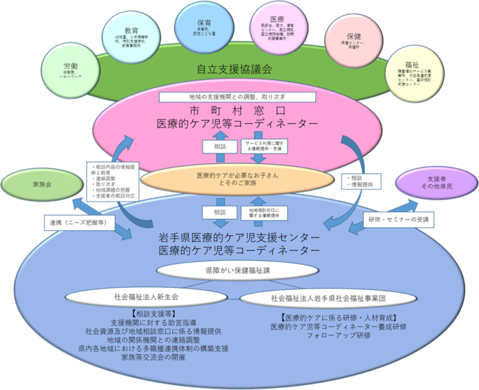 NICU設置病院との連携による早期段階における支援の実現、岩手医科大学障がい児者医療学講座との連携による支援に係る取組の充実など、医療・保健・福祉・保育・教育等の支援機関及び市町村との連携強化・助言・指導により、県内各地域における小児在宅支援体制の整備を推進しています。