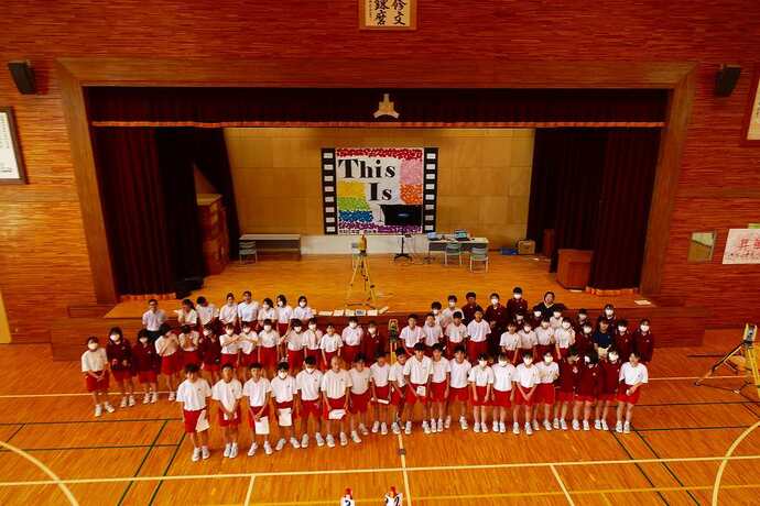 トータルステーション(測量器械)を使って体育館に西根中学校の校章を描画、地上レーザースキャナの最新技術体験、ドローン操作体験