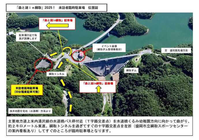 - 綱取ダム管理事務所会場近くに臨時駐車場を設けますので、自家用車の方は、現地案内に従ってご来場ください。(注 大葛自然公園には駐車できません)